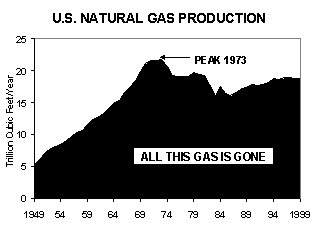THE PAST AT A GLANCE Gas is the "youngest" of the fossil fuels; its use has risen 1000-fold since 1900. Domestic production was negligible before 1920, rose sharply after World War II, peaked in 1973, dipped during the "gas bubble" of the 1980s, and has flat-lined since. In the past 80 years, we've consumed about 950 trillion cubic feet. By some estimates, almost half the gas that will ever be produced in this country has already been burned. Easy come, easy go. Half gone, half left. Much of the "gone" was cheap and easy to produce. Much of what's left will be relatively more expensive and difficult to extract. The Big Easy is over.