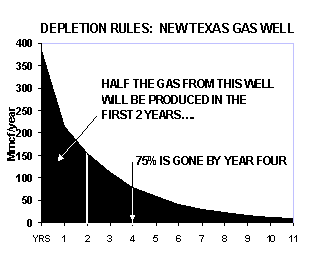 THE DEPLETION TREADMILL In June 1999, a disturbing article was published in Oil & Gas Journal. It described how Texas, which produces one-third of the nation's gas, must drill 6,400 new wells each year to keep its production from plummeting. That's 17 wells each day. As recently as 1998, the state only needed to drill 4,000 wells to keep annual production steady. The reason for the change? As drillers target ever-smaller pools, new wells experience steeper depletion rates. Indeed, a typical new well has an astounding first-year decline of 56%, which is another way of saying it begins dying soon after it is born. No one likes talking about depletion; it is the crazy aunt in the attic, the emperor without clothes, the wolf at the door. But the truth is that drillers in Texas are chained to a treadmill, and they must run faster and faster each year to keep up.