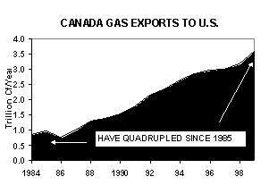 CANADA TO THE RESCUE? The United States is the world's largest importer of natural gas. But unlike oil, which we buy from 25 nations, 99% of our gas is produced here in North America. Domestic supplies meet 85% of our needs, the other 15% comes from Canada. Most Canadian gas is produced in Alberta, although significant new fields have been found near Nova Scotia. The Canadians have historically been eager to ship methane south, and today half the country's gas is exported to the States. But last winter, as Canadian gas bills doubled, a debate over this practice began. Canada is, after all, a frigid country and some Canadians are beginning to suggest capping the amount of gas sent to the "damn Yankees" so that future generations will have adequate supplies. Gas fields in western Canada are aging like those in Texas, and the Canadians are wrestling their own depletion demons, running their own treadmill. It takes 20 new wells per day, nearly 7,500 per year, to keep Alberta's production from declining.
