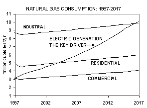 TRILLION DOLLAR GAMBLE With no debate, and little consideration of the long-range implications, the nation has embarked on a "dash for gas." This chart shows how future gas prices will be driven by skyrocketing demand for gas-fired electricity. To meet the electricity sector's gluttonous appetite-forecast to triple by 2015-we will need to build a pipeline to Alaska, double the number of drilling rigs, and open large swaths of federal land now off-limits to drilling. But even that may not be enough. In truth, the dash for gas may be the ultimate pipe dream, a dangerous delusion, a risky chimera, an ill-considered "vision in search of reality." If it turns out that we can't find sufficient gas to run hundreds of new powerplants, then what? Pick from this list: build new coal or nuclear plants; get serious about renewables, particularly wind power, now cheaper than gas; or invest real money in energy efficiency. Coal is our most abundant fossil fuel, but it also carries the specter of climate change; no nuclear plants have been ordered in 22 years; renewables are increasingly cost-effective but intermittent. Efficiency is a proven winner, but it's not a "free lunch." All solutions require time and capital. During the interim, we may soon hit an "energy ceiling," beyond which consumption can not grow.