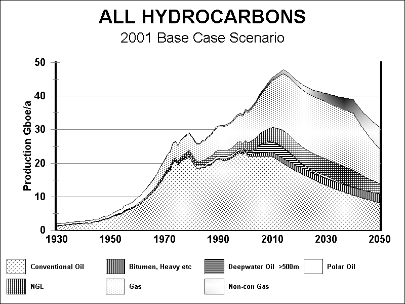Conventional oil production is shown flat until 2010 when it commences its long-term terminal decline at about 2% a year. The inclusion of Condensate with Conventional oil in this year's assessment increased the total endowment to just over 1900 Gb. This has been rounded up to 1950 Gb by adding some "unforeseen" Reserves and Yet-to-Find, to avoid giving the impression of unjustified accuracy.