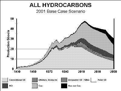 As Figure 1 shows, the peak of Conventional oil may have been passed in 2000, if the plateau is as flat as depicted. The peak of all liquids comes around 2010, followed by the peak of all hydrocarbons around 2015. The entry of deepwater production and growing NGL from gas is seen as critical. If they come in as forecast, overall oil production need not fall below present levels for about twenty years.