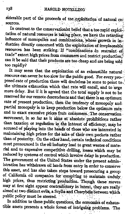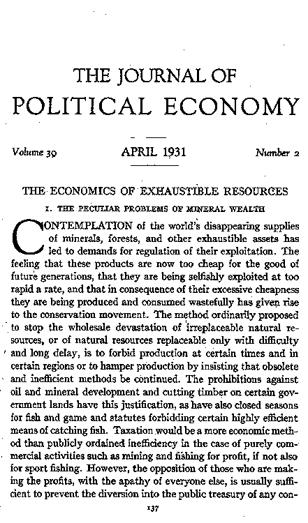The Harold Hotelling paper is often referenced because of its description of the "Free Market" mechanism by which our descendants are systematically deprived of any significant access to the finite natural resources which we currently have at our disposal. This mechanism works as follows.