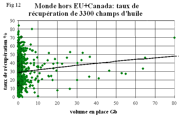 Bien que le fichier Petroconsultants 1996 liste plus de 17000 champs pour le monde hors EU+Canada, les informations sont incomplétes à cause de la confidentialité des données et il est seulement possible d'étudier un peu plus de 3300 champs d'huile dont le taux de récupération est connu. La figure 12 montre le taux de récupération de ces champs d'huile en fonction des volumes en place avec un tracé de regression parabolique: la dispersion est énorme (de 0 à 80%) pour les petites accumulations avec une moyenne proche de 30%, pour les accumulations importantes (>10 Gb), la dispersion est moindre (10-50%) et la moyenne croît vers 40%.