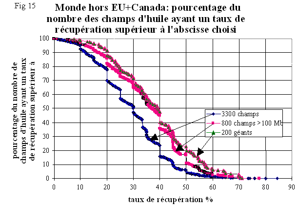 La figure 15 donne le pourcentage du nombre des 3300 champs ayant un taux de récupération supérieur à l'abscisse choisi. Ainsi seulement 10% des champs ont un taux de récupération supérieur à 45%, si on prend les 800 champs ayant des réserves supérieures à 100 Mb, le taux augmente à 50% et pour les champs supérieurs à 500 Mb (200 géants) à 57%: les grands champs ont un taux de récupération supérieur aux petits champs; on retrouve les résultats de la figure 12. Par contre si on prend la valeur médiane, 50% de tous les champs ont un taux supérieur à 30%, 50% des champs >100Mb un taux supérieur à 36%, et 50% des champs géants également un taux supérieur à 39%. Nous avons tracé la courbe pour les 312 géants de Roadifer (1987, mais estimation 1984). La courbe 1984 se superpose jusqu'à la valeur du taux de récupération de 30%, ensuitela courbe descend: il semble que le taux de 30% était un chiffre très utilisé, par contre la courbe des géants 1984 rejoint la courbe des géants 1996pour les taux élevés de plus de 50%. On voit donc de 1984 à 1996 une augmentation du taux, mais seulement pour la fourchette 30-55%.