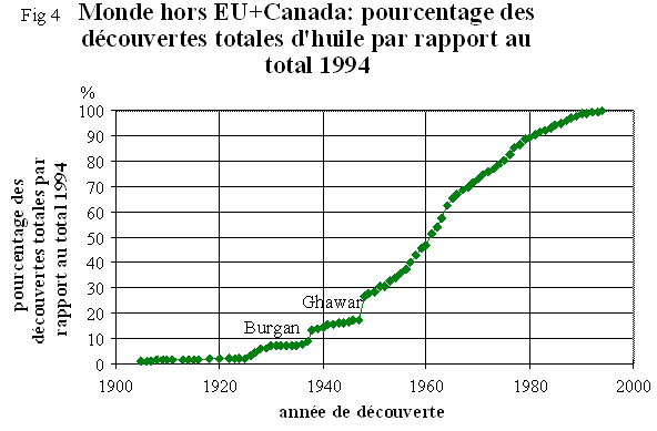 La figure 4 montre pour le monde hors EU+Canada le pourcentage des découvertes cumulées d'huile par année par rapport au total de 1994. La moitié des découvertes actuelles avait été mise en évidence déjà en 1960 et, au premier choc pétrolier de 1973, 80% des découvertes actuelles avaient déjà été faites. Cela explique pourquoi actuellement on vend ce pétrole si bon marché, il a été découvert en grande majorité il y a plus de 25 ans avant le premier choc pétrolier! Sur les 14 dernières années seulement 10% ont été découverts, alors que dans la décennie 60 on en avait découvert 25%.