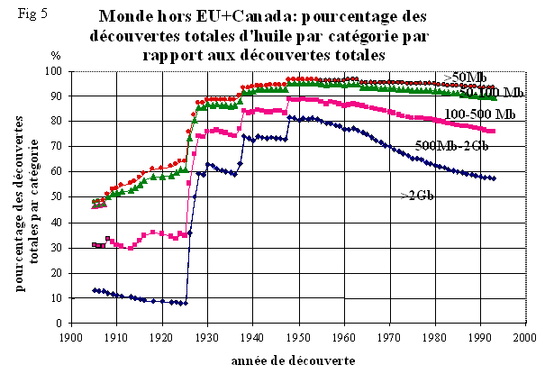 La figure 5donne le pourcentage des découvertes cumulées d'huile par catégorie pour l'année considérée. Au début du siècle, plus de 50% des découvertes totales se trouvait dans les champs de moins de 50 Mb. En 1930 les champs de moins de 50 Mb ne représentaient guère plus de 10% pour descendre à moins de 5% en 1950, année où les champs de plus de 2 Gb représentaient 80% des découvertes totales. Actuellement le total cumulé (1400 Gb) est constitué pour 57% (800 Gb) par les champs de plus de 2 Gb, pour 75% par les champs de plus de 500 Mb (les géants), pour 90% par les champs de plus de 100 Mb (les majors) et pour 93% par les champs de plus de 50 Mb.