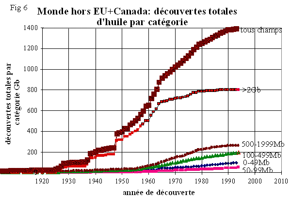 La figure 6 donne la courbe cumulée par catégorie: on peut voir que les courbes sont facilement extrapolables: on ne peut arriver dans un temps limité (50 ans) aux réserves ultimes données par certains!