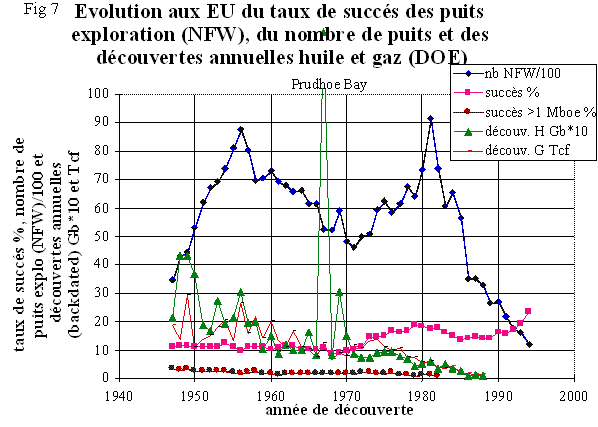 Le taux de succès est resté proche de 10% de 1947 à 1970, puis il a augmenté vers 20% en 1980 (le seuil économique a été abaissé), il a ensuite légèrement baissé et puis est remonté pour actuellement dépasser les 20%. Depuis 1986, moins on fore, plus on est sélectif,et plus le taux de succès augmente. Mais si l'on s'en tient aux seules découvertes significatives (>1 Mboe) on obtient une toute autre image: ce taux qui était de l'ordre de 3% en 1950 a décliné à 1% début 1980 (dernières données API).