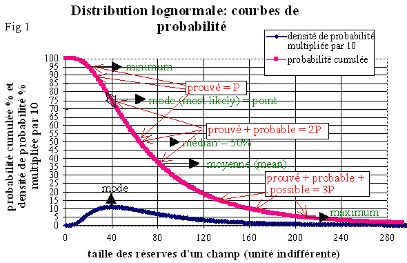 Tous les experts reconnaissent que le meilleur modèle pour représenter la courbe de densité de probabilité de tous les paramètres qui déterminent, dans le calcul volumètrique, les réserves d'un champ, était la loi lognormale (où la distribution est dissymétrique, mais cela couvre aussi à la limite le cas particulier d'une distribution symétrique, à savoir la loi normale). Quand tous les paramètres sont indépendants (ce qui est le cas en quasi totalité) la valeur résultante, à savoir le chiffre des réserves du champ, suit aussi une loi lognormale. Par contre la distribution des réserves d'un large nombre de champs d'un système pétrolier ne suit pas une loi lognormale (qui présente un déficit important en petits champs), mais une distribution de type "fractale parabolique" (1996 b).