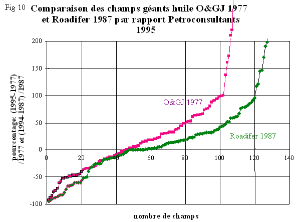 Les études anciennes publiées sur les réserves des champs géants ont été comparées aux valeurs actuelles de Petroconsultants. La figure 10 compare les réserves des champs géants d'huile publiées indépendemment en 1977 (O&GJ) et en 1986 (Roadifer sur des données 1984) avec les valeurs 1995 de Petroconsultants. Si on élimine les valeurs extrêmes négatives et positives, on voit que pour la quasi majorité des champs le pourcentage de changement varie de -50% à +100%, c'est-à-dire que les valeurs initiales ont été modifiées d'un facteur allant de 0,5 à 2. On constate qu'il y a presque autant de valeurs négatives que de valeurs positives, aussi bien pour les chiffres de 1977 que pour ceux de 1987.