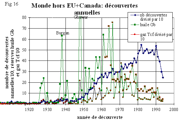 La courbe de découverte annuelles dans le monde hors EU+Canada de la figure 16 montre très bien le déclin des découvertes depuis 1960 pour l'huile, depuis 1970 pour le gaz, et depuis 1985 pour le nombre de découvertes.