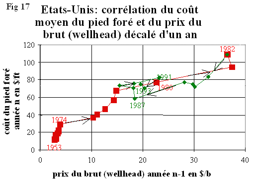 Certains experts extrapolent (ou suggérent une extrapolation linéaire) la diminution des coûts du passé dans le futur sans toujours préciser la cause de cette diminution. L'argument principal est que les coûts de la Mer du Nord ont diminué de 70% de 1983 à 1993 et que la durée du forage a été divisé par deux. Il est dangereux de prendre comme référence une valeur anomalique. Les années 1980-1985 ont été appelées les "années folles", on faisait alors n'importe quoi, car les études économiques avec une prévision de 50$/b permettaient toutes les folies. La diminution des coûts après le contrechoc de 1986 est principalement dûe à la diminution du prix des services et notamment des tarifs journaliers des appareils de forage. Pendant les vaches grasses, les contracteurs et les opérateurs prennent du gras, ils le perdent pendant les vaches maigres. Là encore l'exemple des EU est frappant (figure 17): le coût moyen du pied foré (toutes catégories) donne une excellente corrélation linéaire avec le prix moyen du brut ("wellhead") de l'année précédente pour la période 1953-1993 avec un coût maximum en 1982, puis mini en 1987, puis remaxi en 1991, puis rebaisse. On se retrouve actuellement avec un coût et un prix du même ordre qu'en 1980. Si on actualise les coûts et les prix avec l'indice des prix à la production (Megill 1995), le schéma est le même (relation linéaire) et les coûts oscillent pour les dernières années autour des conditions de 1988 On ne voit pas là d'amélioration notable attribuable à la technologie.