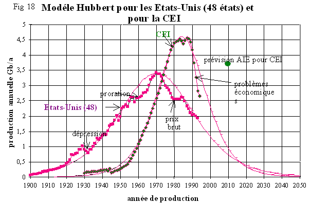 Les modèles ont fait de grands progrès, mais cela a démarré bien avant 1973! Le géologue King Hubbert avait dès 1956 annoncé que la production des EU (48 Etats) plafonnerait vers 1970 et aurait un déclin symétrique (courbe en cloche dérivée de la courbe bien connue dite logistique pour la croissance des populations par Verlhust en 1845). Tout le monde a souri, car le profil de production d'un champ est dissymètrique. Mais en 1970 la production des EU a décliné et maintenant on réalise qu'Hubbert avait globalement raison. D'abord l'addition d'un grand nombre de profils dissymétriques indépendants donne un profil symétrique (théorème de "central limite"). Ensuite pour la quasi totalité des pays producteurs, il y a (Campbell et al 1995) une bonne corrélation entre la courbe de production annuelle et la courbe de découvertes annuelles (backdated) décalée d'un certain nombre d'années (de 5 à 20 ans). La figure 18 montre pour les EU (48 Etats) que la courbe est en gros symétrique, avec des écarts qui correspondent toujours à des contraintes non techniques: 1930= dépression, 1955= proration, 1979= prix élévé du brut.