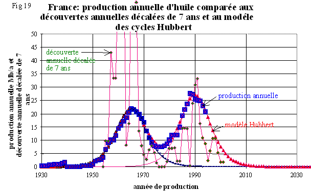 La France (figure 19) montre une corrélation pour un décalage de 7 ans (Laherrère 1996 a): le creux de production des années 1975 correspond au creux de découvertes de la fin des années 60; le pic de production autour de 1990 correspond au pic de découvertes de 1984. Lorsqu'il y a peu de champs et de bassins, les découvertes présentent plusieurs cycles.