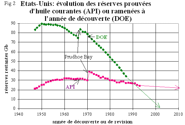 Les EU ajoutent chaque année par révision des réserves bien supérieures aux nouvelles découvertes. Depuis 1947 les réserves américaines dites prouvées par l'American Petroleum Institute (API 1995) ont augmenté de 25 à 40 Gb (pic dû à l'Alaska) en 1971, pour redescendre à 25 Gb. Le DOE a publié en 1990 un rapport où les réserves telles qu'elles sont connus au moment du rapport sont attribuées à l'année de découverte (backdating). La figure 2 montre la courbe API des réserves courantes et la courbe DOE des réserves ramenées à l'année de découverte. La courbe API peut être extrapolée sans grand problème jusqu'en 2010 à un niveau de 20 Gb, amenant à dire qu'il n'y a aucun problème pour continuer à produire un volume important bien qu'en léger déclin puisque l'on continue à ajouter des réserves. La courbe DOE ne peut être extrapolée que vers des réserves (conventionnelles) quasi nulles entre 2000 et 2010. Les mêmes chiffres de réserves mais attribués à des dates différentes conduisent à des images bien différentes. Il est à noter que la date de découverte de Prudhoe Bay (brusque augmentation) est aussi différente: 1971 pour API et 1967 pour DOE.