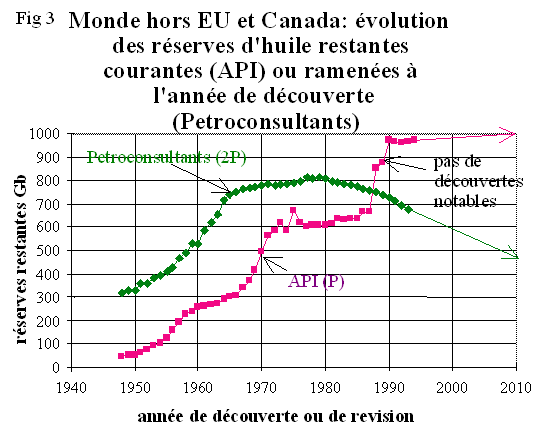 La figure 3 donne, à partir du fichier Petroconsultants (1995), des courbes similaires pour le Monde hors EU+Canada. La courbe API donne les réserves dites prouvées revisées chaque année, on peut y voir une augmentation de 1947 à 1973 puis une stabilité autour de 620 Gb suivie de 1987 à 1990 par un saut de 300 Gb (près de 50%) quand certains pays de l'OPEP ont fortement augmenté leurs réserves (afin d'obtenir un quota supérieur) sans avoir fait de découverte notable. Stabilité de nouveau depuis plusieurs années que beaucoup extrapolent un peu vite jusqu'après 2010. Par contre la courbe des réserves restantes du fichier Petroconsultants (prouvées + probables) "backdated" a augmenté de 1947 à 1965, puis a plafonné à 800 Gb en 1980 pour redescendre vers 680 Gb avec une extrapolation vers 500 Gb en 2010. Si la technologie a bien amélioré les résultats, elle n'a pas pu s'opposer au déclin naturel de la nature qui montre toujours des rendements décroissants après une période d'augmentation.