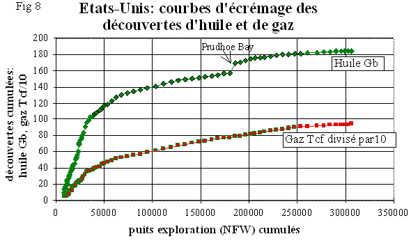 La courbe dite d'écrémage ("creaming curve" de Shell), ou la courbe des réserves cumulées ramenées à l'année de découverte ("backdated") en fonction du nombre cumulé de puits d'exploration, a l'avantage, par rapport aux courbes en fonction du temps, de ne pas réfléter les à-coups de l'activité d'exploration. Elle est, pour les pays possédant un grand nombre de bassins et de champs, généralement hyperbolique. L'example des EU (figure 8) montre bien, aussi bien pour l'huile que pour le gaz, une montée rapide suivie par un tracé devenant proche de l'horizontale.