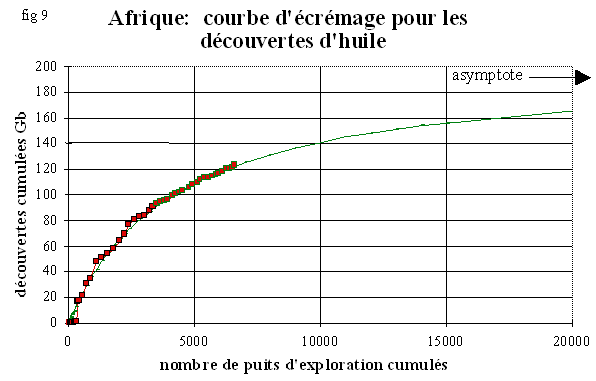 La courbe d'écrémage des découvertes d'huile de l'Afrique (figure 9) montre un début d'hyperbole presque parfait avec une asymptote de 200 Gb alors que le total actuel est de 125 Gb pour 6700 puits d'exploration. Si on suit le modèle hyperbolique, en forant 3300 puits supplémentaires on ne découvrira que 15 Gb supplémentaire (total 140 Gb).