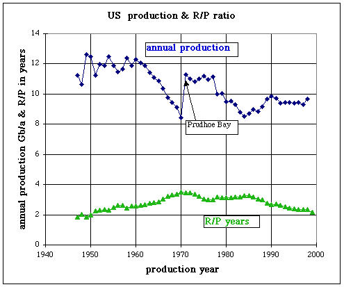 His graph 14 with a growth of 2%/a and a decline of 2%/a is a fair display of the 3000 Gb ultimate, giving a peak of 35 Gb/a (96 Mb/d) in 2016. But the graph 15 assumes a decline of R/P =10, when in fact it shows a decline of 10%/a. For the last 50 years the US R/P has oscillated around 10 years as it is a rule of thumb of most independent oilmen for estimating reserves. Even the USGS in some reports when they have no data on reserves assume the reserves at 10 times the present annual production. This R/P ratio stood around 10 (12 to 8) during the growth of production up to 1970 and afterwards, during the decline.