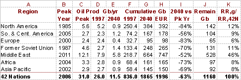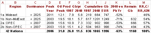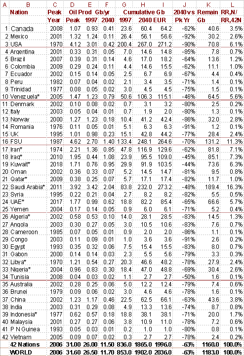 Table 1. Petroleum Production Summary: Nations and World. Columns, 1-to-r: Nation's number and name. Production peak years, some firmly established; others forecast, for 42 nations representing more than 98% of total world oil production. Peak production rate, 1997 rate, and forecast 2040 rate Cumulative production through 1997, forecast cumulative production through 2040, and expected ultimate recovery (EUR). Percent fall from peak to 2040. Remaining reserves. Far right column: The telling ratio of the remaining reserves of each nation to the remaining reserves of all 42 nations. Saudi Arabia alone controls 16.3% of the world's future oil supply. Notes: SI units are used in this study where 'G' means billion (109), and 'b' means barrels. '*' Designates OPEC member. '+' Indicates that relevant figures are increased by 2% top account for nations omitted from this list.