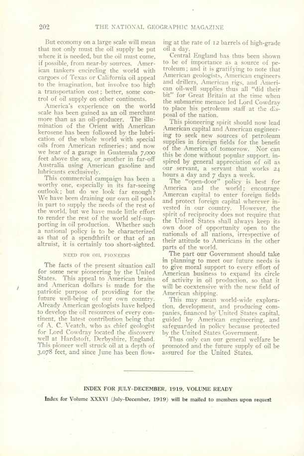 | Page 202 | Need for oil pioneers ... "The pioneering spirit should now lead American capital and American engineering to seek new sources of petroleum supplies in foreign fields for the benefit of the America of tomorrow. Nor can this be done without popular support inspired by general appreciation of oil as our servant, a servant that works 24 hours a day and 7 days a week". | |