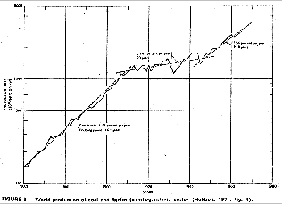 In the semilogarithmic plotting of Figure 3, three separate periods of exponential growth in coal mining are shown. The first and principal phase extends from 1860 to World War I. During this period production increased at a rate of about 4.4 percent per year with a doubling period of 16 years. During the second period from World War I to World War II the growth rate dropped only 0.75 percent per year. Then following World War II, an intermediate rate of 3.6 percent per year ensued.