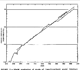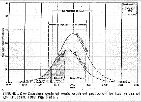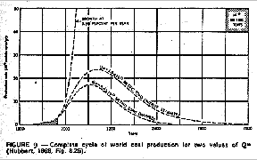 What is most strikingly shown by these complete-cycle curves is the brevity of the period during which petroleum can serve as a major source of energy. The peak in the production rate for the United States has already occurred three years ago in 1970. The peak in the production rate for the world based upon the high estimate of 2100 billion barrels, will occur about the year 2000. For the United States, the time required to produce the middle 80 percent of the 170 billion barrels will be approximately the 67-year period from about 1932-1999. For the world, the period required to produce the middle 80 percent of the estimated 2100 billion barrels will be about 64 years from 1968 to 2032. Hence, a child born in the mid-1930s if he lives a normal life expectancy, will see the United States consume most of its oil during his lifetime. Similarly, a child born within the last 5 years will see the world consume most of its oil during his lifetime.