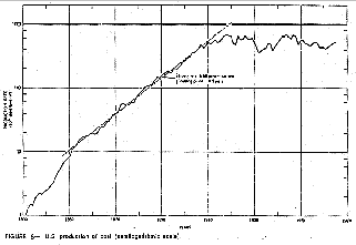 Coal production in the United States is shown on a semilogarithmic graph in Figure 6. In this case, the uniform exponential-growth phase persist from 1850 to 1907, with an average growth rate of 6.6 percent per year and a doubling period of 10.5 years. The corresponding growth in the annual production of crude oil in the United States, exclusive of Alaska, is shown in Figure 7. As in the case of world production, the growth rate initially was somewhat higher than that later. After 1875 annual production increased at a uniform exponential rate of 8.3 percent per year with a doubling period of 8.4 years until the beginning of the Depression following 1929.