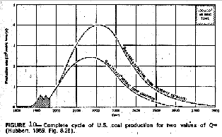 Utilizing this principle, curves for the complete cycles of coal production for the world and for the United States are shown in Figures 9 and 10. In each ease the upper curve corresponds to an estimate of recoverable coal made by Averitt of the U.S. Geological Survey. For the world Averitt estimated the initial quantity of recoverable coal assuming 50 percent recovery of coal in place, amounts to 7.6 × 1012 metric tons, and for the United States 1.5 × 1012 metric tons. These figures, however, include coal in beds as thin as 14 inches and to depths of 3000 feet or more. Since coal beds of such depths and thinness are not very practical sources for mining, actual minable coal may be considerably less than Averitt's maximum figures. This fact is indicated by the lower curves in each of Figures 9 and 10, based upon figures about half those by Averitt.