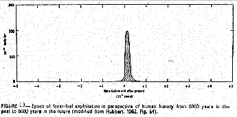 A better appreciation of the epoch of the fossil fuels in human history can be obtained if the complete production cycle for all the fossil fuels combined -- coal, oil, natural gas, tar sands, and oil shales--is plotted on a time span of human history extending from 5000 years in the past to 5000 years in the future, a period well within the prospective span of human history. Such a plotting is shown in Figure 13. This Washington Monument-like spike, with a middle 80-percent span of about three centuries, represents the entire epoch. On such a time scale, it is seen that the epoch of the fossil fuel can be but an ephemeral and transitory event-an event, nonetheless, that has exercised the most drastic influence so far experienced by the human species during Its entire biological existence.