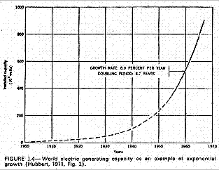 In our earlier review of the rates of production of the fossil fuels it was observed that for close to a century in each case the production increased exponentially with doubling periods within the range of 8 to 16 years. The same type of growth rates are characteristic of most other industrial components. Figure 14 is a graph showing the exponential growth of the world electric generating capacity. The solid part of the curve since 1955 shows a growth rate of 8.0 percent per year with a doubling period of 8.7 years. The dashed part of the curve shows approximately the growth since 1900. In the United States during the last several decades electric power capacity has been doubling about every 10 years. The world population of automobiles and also passenger miles of scheduled air flights are each also doubling about every 10 years.