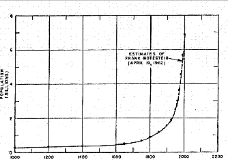In Figure 15 a graph is shown of the growth of the world's human population from the year 1000 A.D. to the present, and an approximate projection to the year 2000. This is important in that it shows the ecological disturbance of the human population produced by the development of technology based upon the fossil fuels, the concomitant developments in biological and medical science, and expansion into the sparsely settled areas of the newly discovered geographical territories. Note the very slow rate of growth in the human population during the 500 year period from the year 1000 A.D. to 1500, and then the accelerated growth that has occurred subsequently. Were it possible to plot this curve backward in time for a million years, the curve would be barely above zero for that entire period. The flare up that has occurred since the year 15M is a unique event in human biological history.
