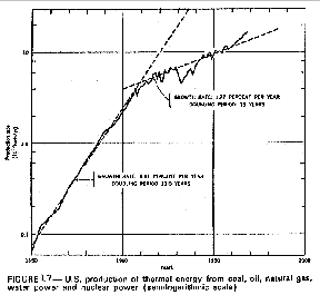 Figure 17 Is a graph plotted on a semilogarithmic scale of the production of energy from coal, oil, gas, and water power and a small amount of nuclear power from 1850 to 1969. From 1850 to 1907 the production of energy increased exponentially at a rate of 6.91 percent per year, with a doubling period of 10.0 years. Then during the three-year period from 1907 to 1910, the growth rate dropped abruptly to a mean rate of 1.77 percent per year and the doubling period increased to 39 years.