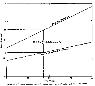 A graphical illustration of the relations between the monetary growth, physical growth, and price inflation is shown In Figure 19. The upper straight line represents the exponential growth of money at the interest rate i; the lower curve the physical growth at the lower rate a. The ratio of M to Q at any given time is proportional to the distance between those two curves. If the curves are parallel, the spacing is constant and a stable price level will prevail. If the curves are divergent to the right, the price level will increase at the rate (i-a).