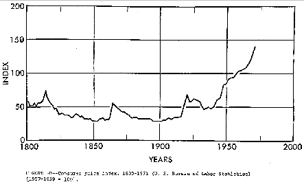 Finally, as confirmatory evidence, there is shown in Figure 20 a graph of the consumer price index as computed for each year from 1800 to 1971 by the U.S. Bureau of Labor Statistics. The three principal distortions coincide with the War of 1812, the Civil War, and World War I. Disregarding these, and drawing a smooth curve under the bases of each gives a very informative result. For the period from 1800 to 1910 the consumer price level remained remarkably stable. Beginning about 1910, at the time of the abrupt drop in the rate of industrial growth, prices began to inflate and they have continued to do so to the present time.