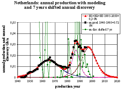 Notice the good correlation between the oil production curves (dark) and (both shifted by 7 years) the discovery curves (green).