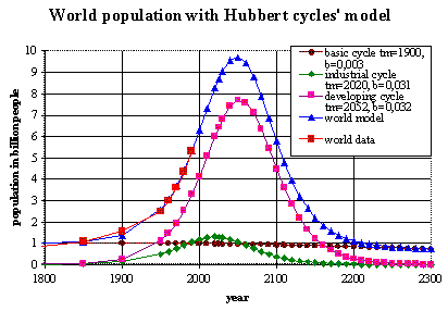Bourgeois-Pichat [1988] said that the industrial population will peak soon with a symmetrical curve (see http://www.ined.fr/publicat/pop_et_soc/pes321/pes3212.html where the French and European populations are forecasted by the European Demographic Observatory until 2050, peaking around 2020-2030) and that the developing countries (which try to follow the industrial countries) will follow the same pattern 40 years later. I modeled the world population with three Hubbert curves: the industrial population, the developing countries' population and the basic population (which does not care for civilization and comfort) as shown: