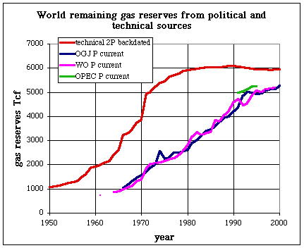It depends which estimates are used. It is important to distinguish technical estimates (confidential) from what are reported (published) for political, commercial or financial purposes. There has indeed been growth in reported reserves, but the technical estimates are little changed, as shown in the graph for conventional gas remaining reserves. Technical reserves are estimated as the mean values (called proven + probable or 2P) and backdated to the year of discovery. The worlds remaining technical reserves have been substantially flat since 1980 at about 6 000 Tcf (Tcf Å EJ), but the reported so-called Proved Reserves (current P) have grown from 3000 Tcf in 1980 to 5200 Tcf in 2000.