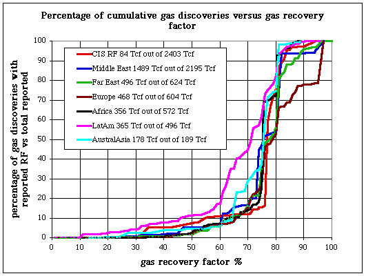 Instead of making assumptions about recovery factor (RF), it is better to look at facts and data, as illustrated on the graph at right. It plainly shows that most gasfields have a recovery factor of more than 75%, meaning that there is little scope for further improvement