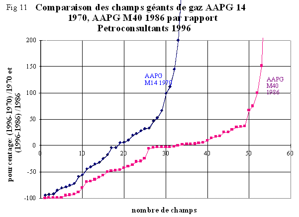 La figure 11 donne le résultat de la comparaison des champs géants de gaz entre les publications AAPG M14 1970 (Halbouty et al sur des chiffres 1968) et AAPG M40 1986 (Carmalt et al sur des chiffres 1984) avec les valeurs de Petroconsultants 1996. Là encore on constate autant de variations négatives que de variations positives.