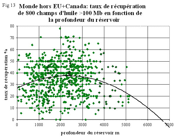 Bien que le fichier Petroconsultants 1996 liste plus de 17000 champs pour le monde hors EU+Canada, les informations sont incomplétes à cause de la confidentialité des données et il est seulement possible d'étudier un peu plus de 3300 champs d'huile dont le taux de récupération est connu. La figure 12 montre le taux de récupération de ces champs d'huile en fonction des volumes en place avec un tracé de regression parabolique: la dispersion est énorme (de 0 à 80%) pour les petites accumulations avec une moyenne proche de 30%, pour les accumulations importantes (>10 Gb), la dispersion est moindre (10-50%) et la moyenne croît vers 40%.