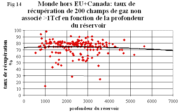 Les 200 champs de gaz non associé avec des réserves supérieures à 1 Tcf montrent sur la figure 14 peu de variations avec la profondeur avec une moyenne de 75% avec une dispersion de 50 à 90%. La moyenne des champs de gaz associé et non-associé est de 66%.