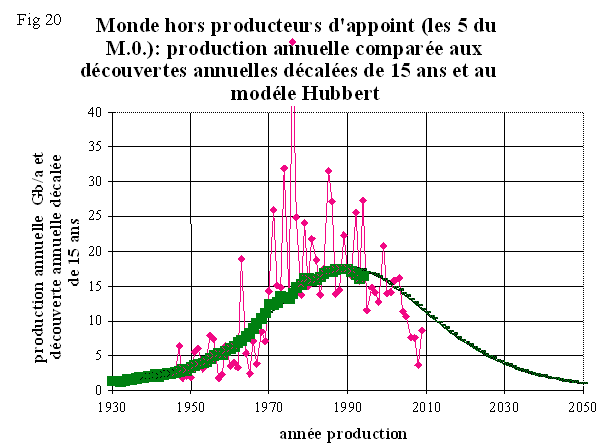 Beaucoup pensent qu'un nouveau choc pétrolier n'est pas possible car si cela arrivait, comme en 1979 on fera appel aux non-OPEP, à savoir au monde hors producteurs d'appoint. La figure 20 montre la corrélation production et découverte (décalée de 15 ans) de ce monde hors producteurs d'appoint, ainsi que le modèle d'Hubbert.