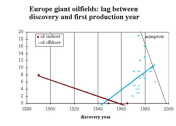 The lag between discovery year and first production year versus discovery year is plotted on figure 1. The plot is limited vertically by the asymptote at 45° up to 1997, as the lag cannot be higher than the